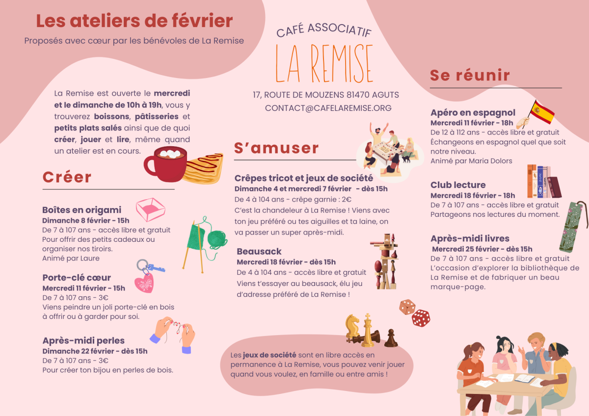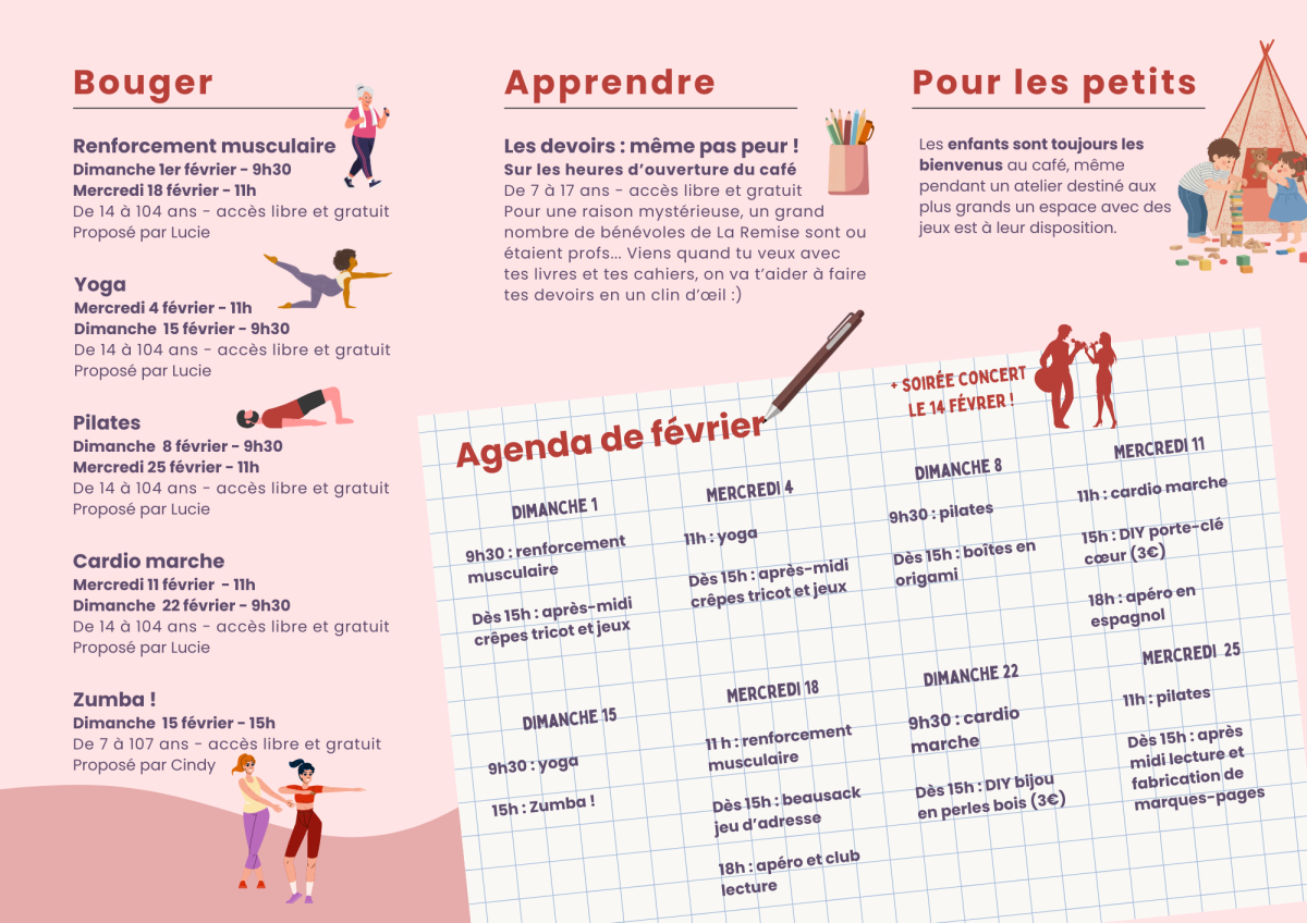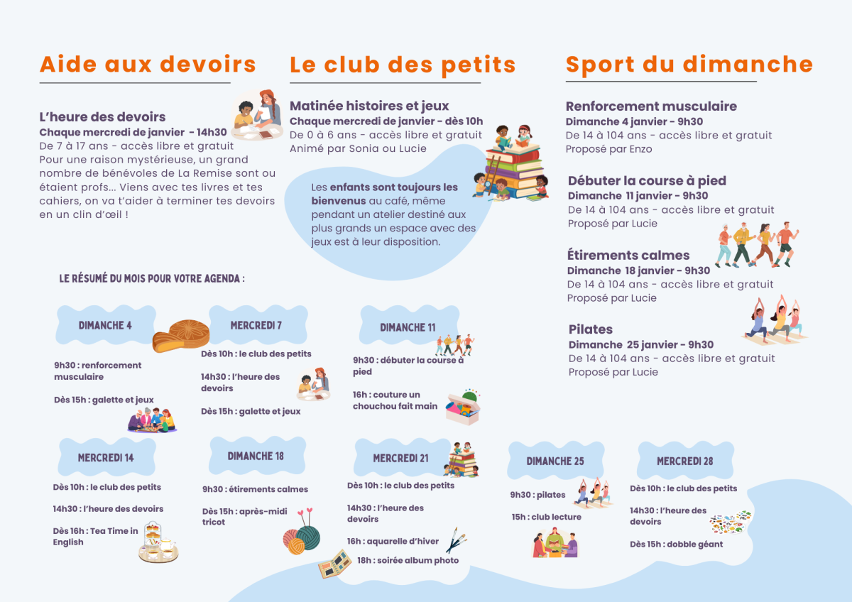 Pour se retrouver et partager de beaux moments conviviaux, chacun peut proposer un atelier : loisirs créatifs, sciences, sport... Il y en a pour tous les goûts et tous les âges ! Le programme est disponible chaque mois sur notre site web et nos réseaux sociaux, vous pouvez aussi vous inscrire à notre newsletter pour le recevoir par mail.