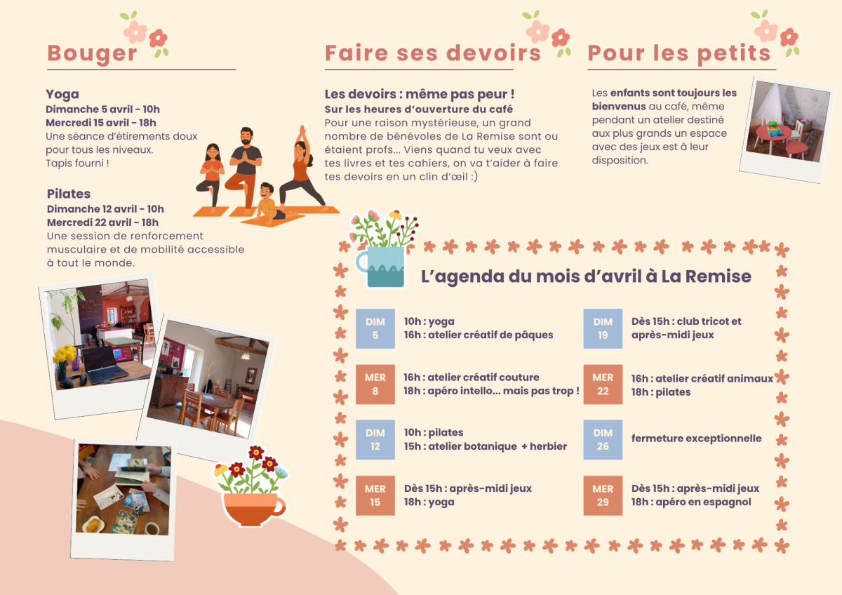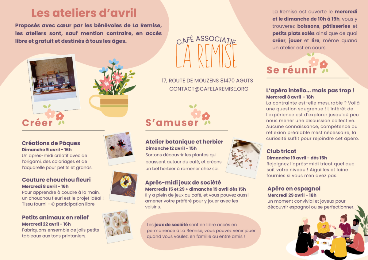 Pour se retrouver et partager de beaux moments conviviaux, chacun peut proposer un atelier : loisirs créatifs, sciences, sport... Il y en a pour tous les goûts et tous les âges ! Le programme est disponible chaque mois sur notre site web et nos réseaux sociaux, vous pouvez aussi vous inscrire à notre newsletter pour le recevoir par mail.